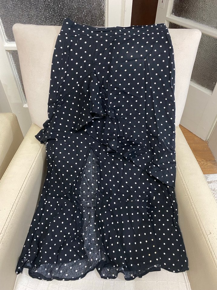 Siyah puantiye desenli, fırfırlı ve uzun boy midi etek. Sentetik kumaştan olup bohem Paris tarzını yansıtır, günlük kullanıma uygundur.