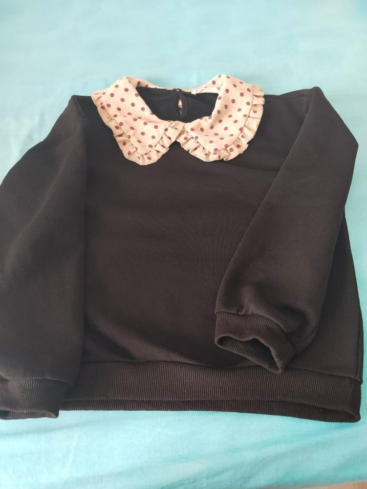 Puantiye desenli fırfırlı yakaya sahip siyah sweatshirt. Uzun kollu, bol kesim ve yumuşak kumaştan üretilmiştir. birkaç defa giyildi sorunsuz