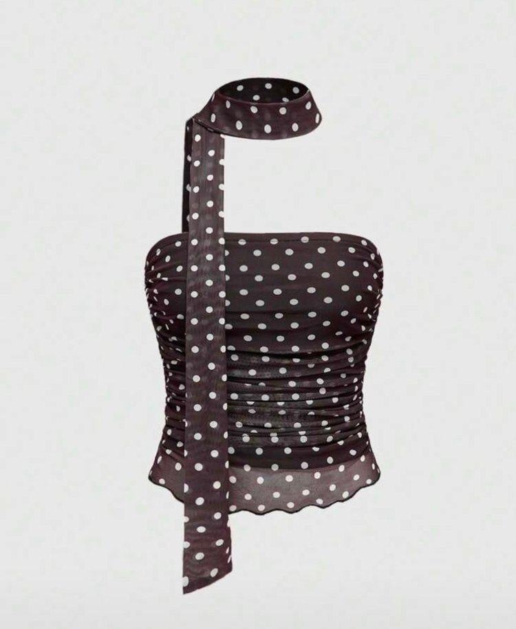 Uzun askılı, puantiye desenli ve kemerli bu kahverengi fitted büstiyer, sentetik kumaştan üretilmiştir. Retro ve goth tarzına uygun, parti için ideal.