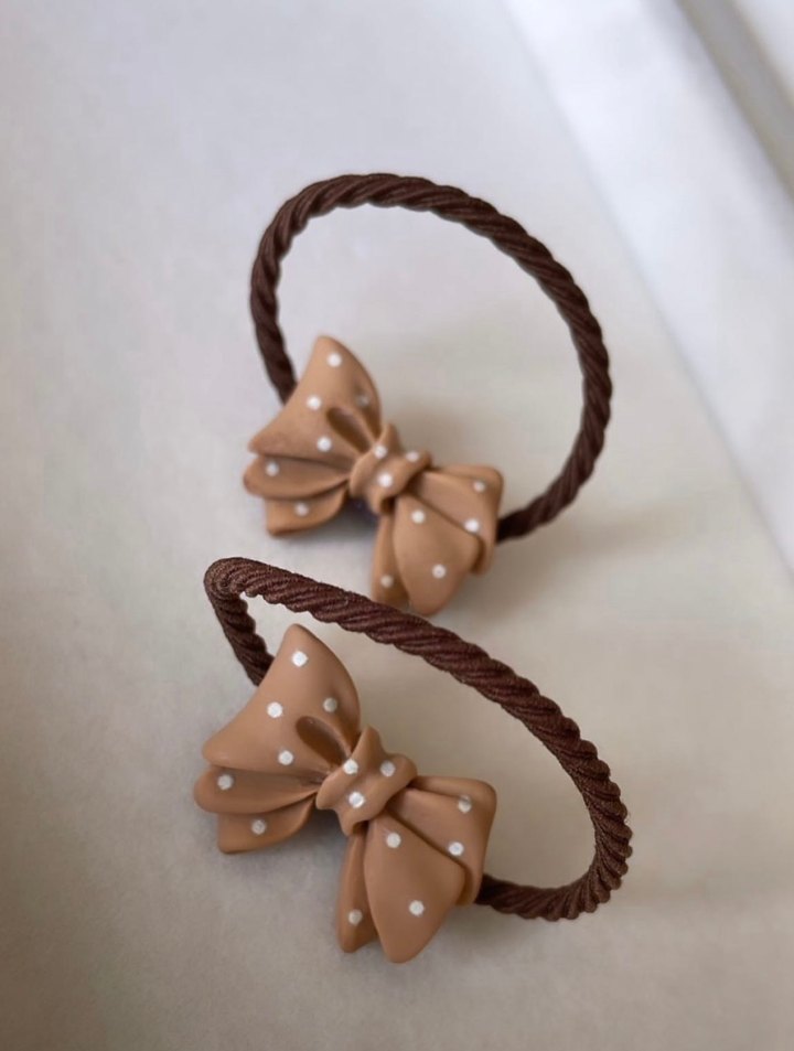 Kahverengi, burgu detaylı çocuk saç tokaları, puantiye desenli fiyonk ile süslenmiş.