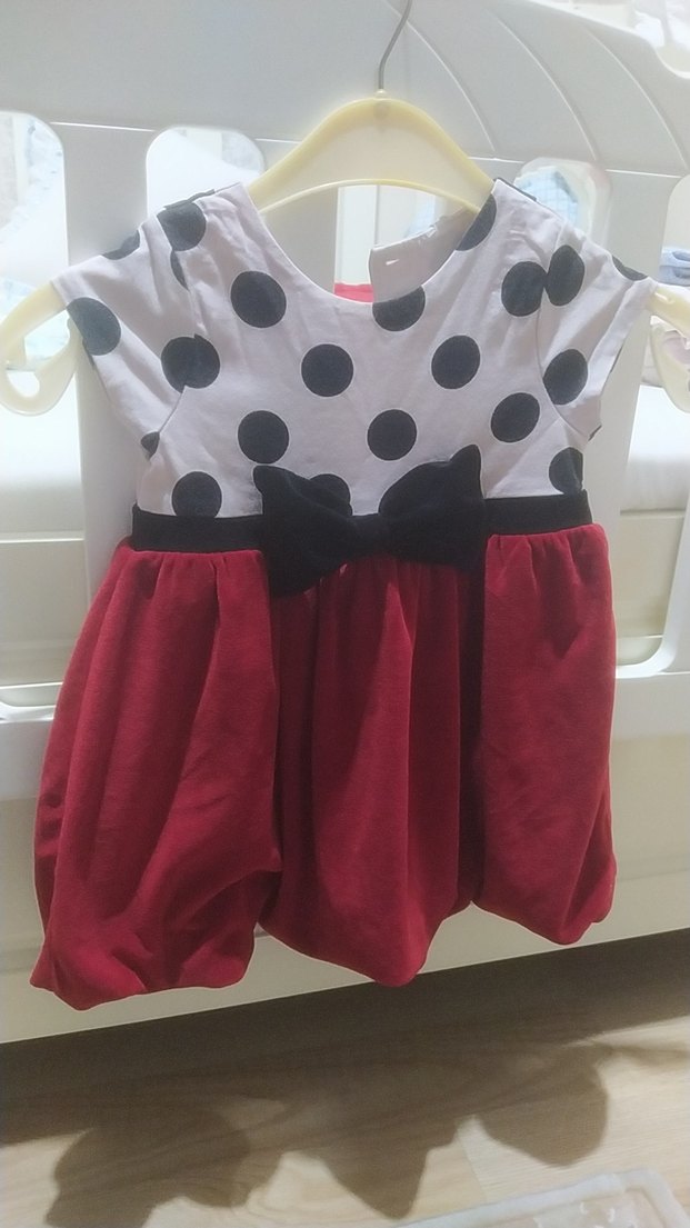 Kız çocuklar için pamuklu, kısa kollu, puantiye desenli üst ve kırmızı renkli etekli, oturan kesim elbise. Fırfır detaylı ve siyah fiyonk aksanlı, şık ve gotik tarzda bir model. kadife