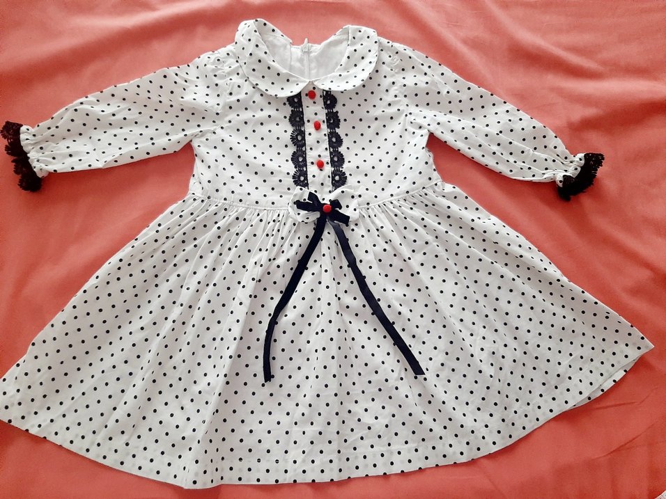 Pamuklu beyaz kumaş üzerine siyah puantiyelerle kaplı, yakalı ve düğmeli, uzun kollu, oturan kesim kız çocuk elbisesi. Fiyonk ve dantel detaylarıyla klasik bohem tarz sunar. hediye gelmişti ama küçük oldu iki kere kısa süreli giyildi. etiketi yok o yüzden yaş bilgisini bilmiyorum. ölçüleri belirttim. MARKA TEMSİLİDİR. DOLABIMDAKİ DİĞER BEBEK ÜRÜNLERİNE DE BAKMANIZI TAVSİYE EDERİM