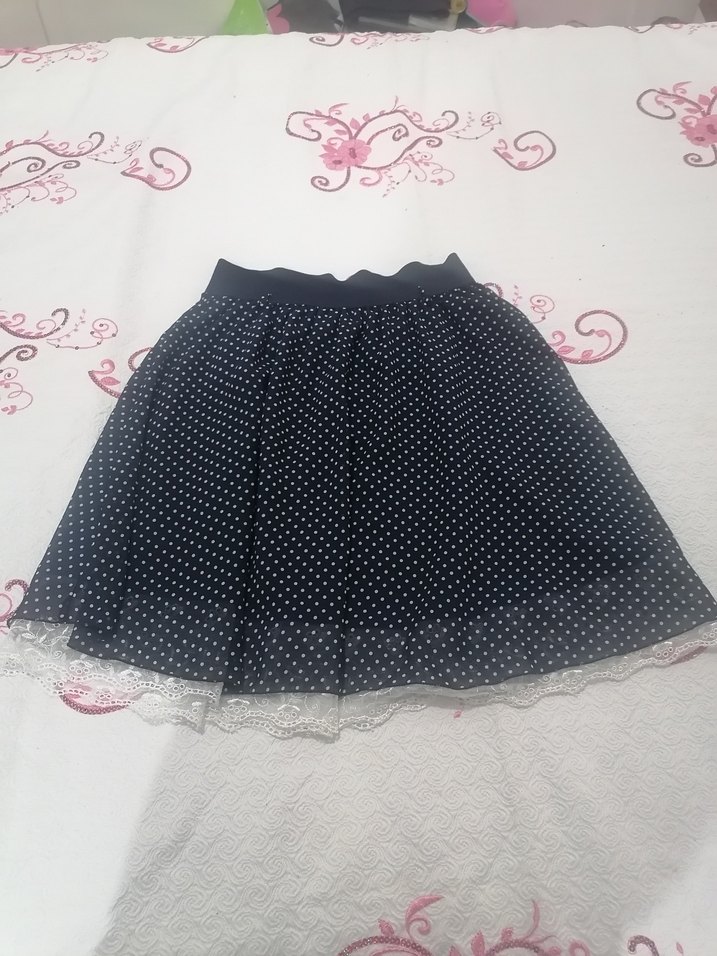 Şifon kumaştan, puantiye desenli ve fırfırlı, larcivert renkli bol kesim kadın eteği.