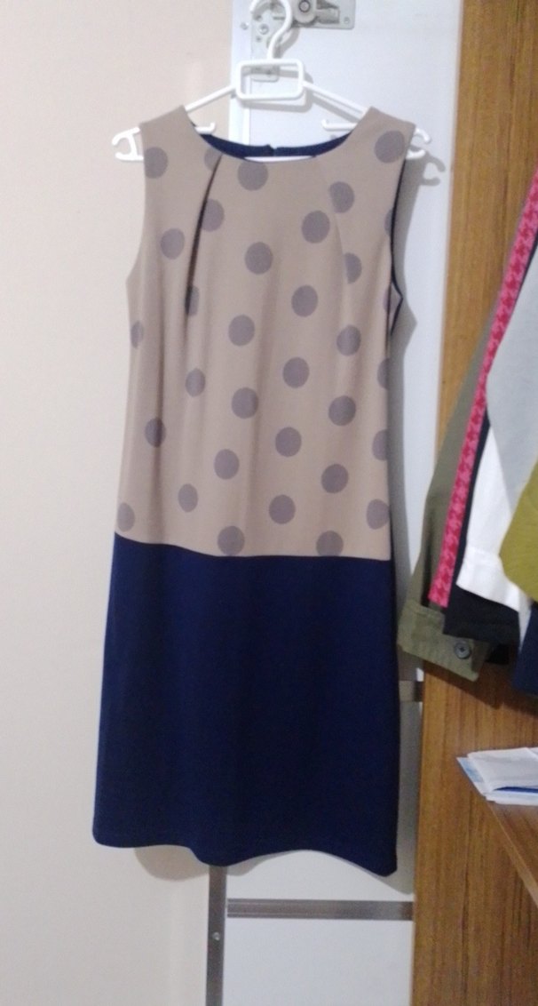 Kolsuz midi elbise, drapeli ve puantiye desenli. Yuvarlak yaka ve regular fit, gri ve mavi renklerle çağdaş bir tarz sunar. Ofis için uygundur.