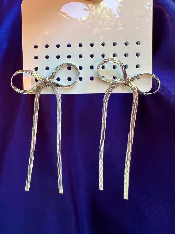 Midi uzunlukta, beyaz puantiye desenli kurdele küpeler, çağdaş ve avangart bir tarz sunar, parti için uygundur.