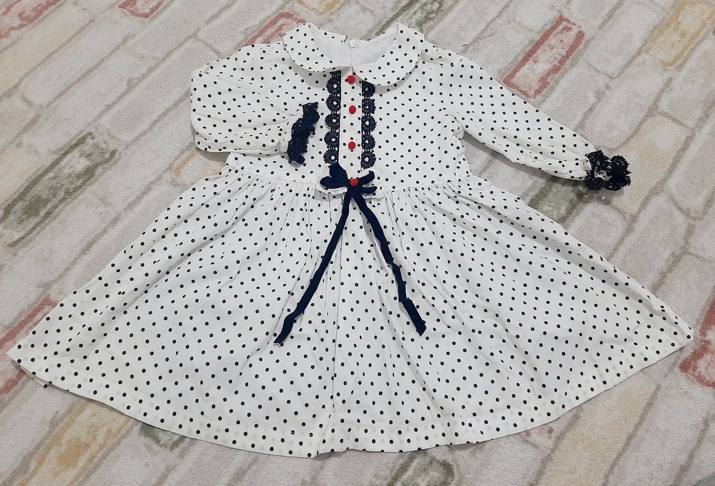 Pamuklu beyaz kumaş üzerinde puantiye desenli, uzun kollu, yakası kesikli, düğmeli ve belde fiyonk detaylı kız elbisesi. puantiyeli kız çocuk elbise. etiket olmadığı için bedenini bilemiyorum ama ölçülerini belirttim. hiç giydirmedim. marka temsilidir. DOLABIMDAKİ DİĞER BEBEK/ÇOCUK ÜRÜNLERİNE DE BAKMANIZI TAVSİYE EDERİM ERTESI GÜN KARGO, SÜRPRİZ HEDİYELER