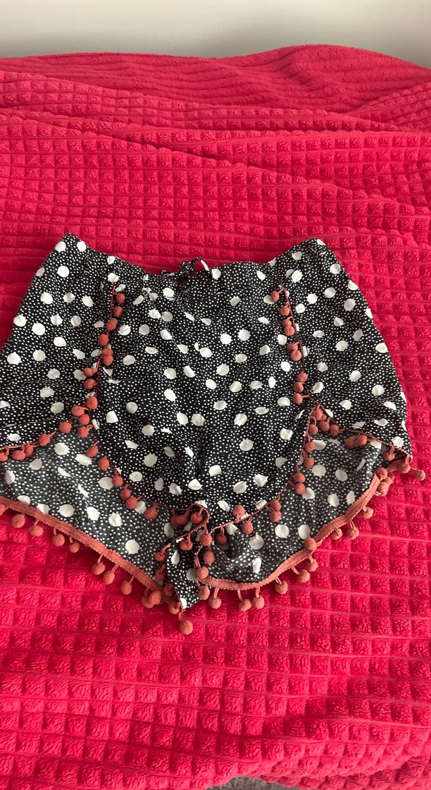 Puantiye desenli, püsküllü ve pomponlu detaylara sahip bol kesim bohem mini şort, romantik akşamlar için uygun.