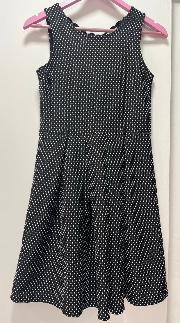 Siyah puantiye desenli, kolsuz, V yaka ve pile detaylı. Boyu 87cm