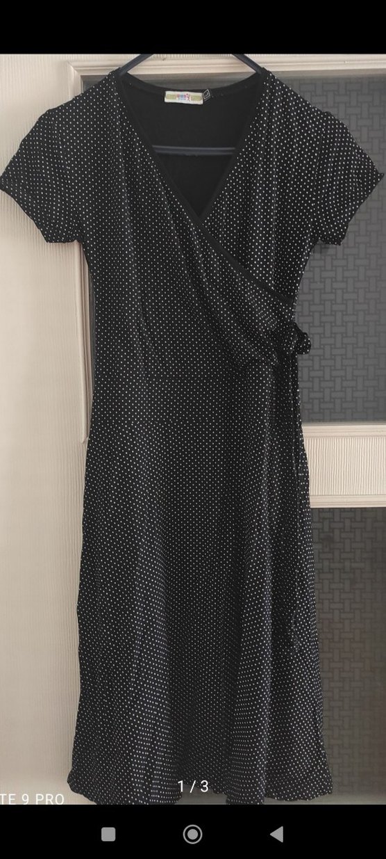 V yakalı ve kısa kollu, vücuda oturan bu hamile elbisesi, puantiye desenli siyah sentetik kumaştan olup ofis için uygundur.