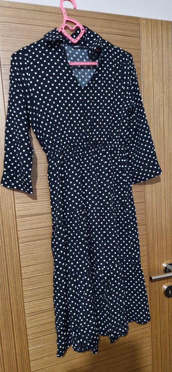 bol kesim, V yaka ve düğmeli ön detaylara sahiptir. Kısa kollu ve puantiye desenlidir, günlük kullanım için uygundur. Kumaşı yumuşak ve sentetiktir, minimalist bohem tarzındadır.