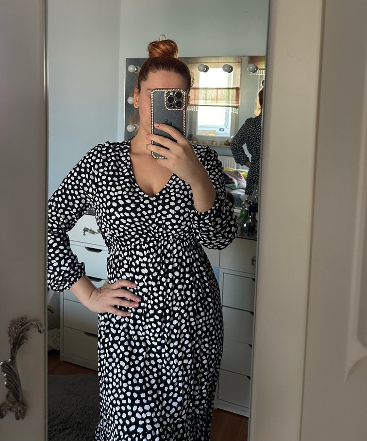 Siyah puantiye desenli elbise, V yaka, uzun kolludur. Midi boy ve bol kesimdir, günlük sokak modasına uygundur. Arkası uzun önü hafif kısa bir çok hoş model