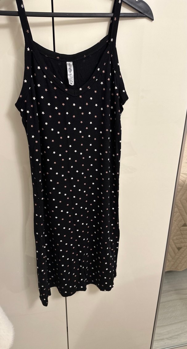 Uzun, kolsuz, bol kesim ve V yakalı bu hamile geceliği siyah renkte olup puantiye desenlidir. Rahat ve şık bir gece kıyafetidir.