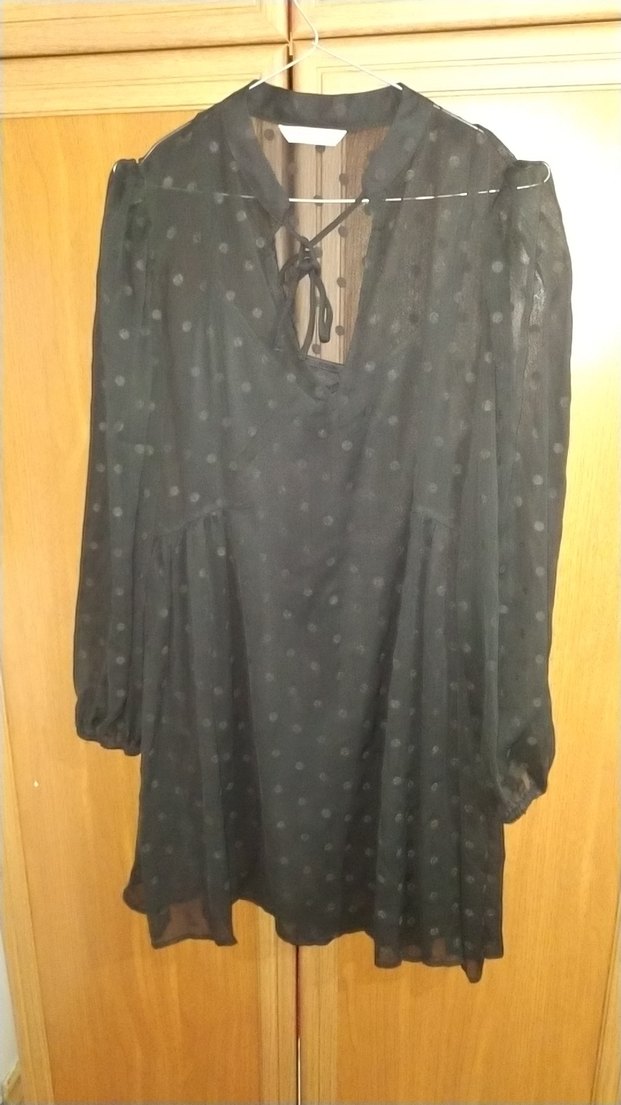 Siyah renkli, puantiye desenli hamile midi elbise. V yaka, uzun kollu ve dökümlü tasarıma sahip, rahat kesimdir. Romantik akşamlar için uygundur.