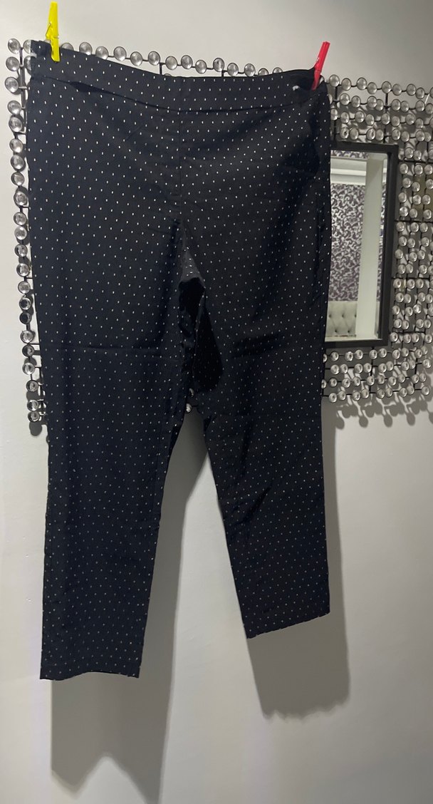 Siyah kumaş pantolon, puantiye desenli, kemerli ve midi boyda, ofis için uygun şık ve trend bir tasarım sunar. Beli lastikli