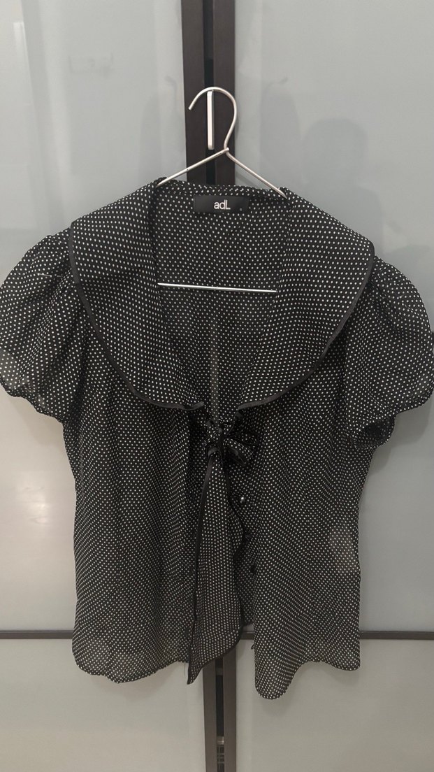 Dar kesim siyah bluz, kısa kollu, yakalı ve düğmeli ön detaylıdır. Puantiye desenli, sentetik kumaştan yapılmıştır. Ofis için uygun, gotik ve Parisli avant-garde tarzında.
