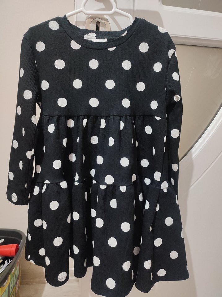 Siyah puantiye desenli kız çocuk elbisesi, uzun kollu ve yuvarlak yakalıdır. Rahat kesimi ve fırfır detaylarıyla günlük sokak stiline uygundur.