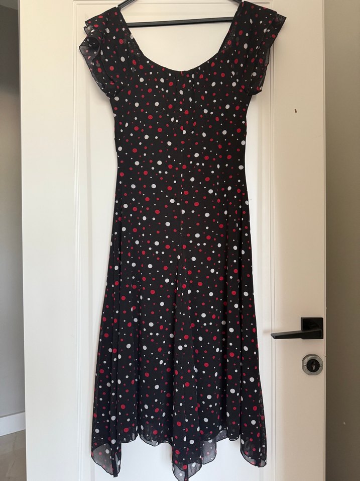Siyah, puantiye desenli midi elbise, kısa kollu ve fırfırlı detaylıdır. V yaka ve ince kesim, sentetik kumaştan yapılmıştır. Romantik akşamlar için uygundur. Defosuzdur