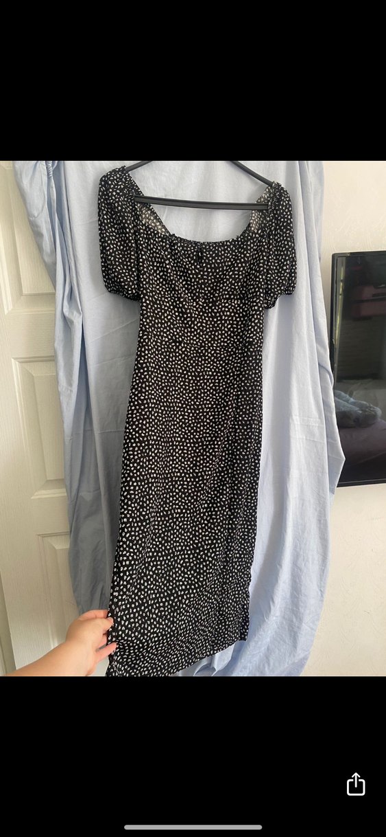 Bu siyah midi elbise, kısa kollu ve kayık yakalı, vücuda oturan kesime sahiptir. Drapeli tasarımı ve minimal puantiye deseniyle günlük sokak stili için uygundur.