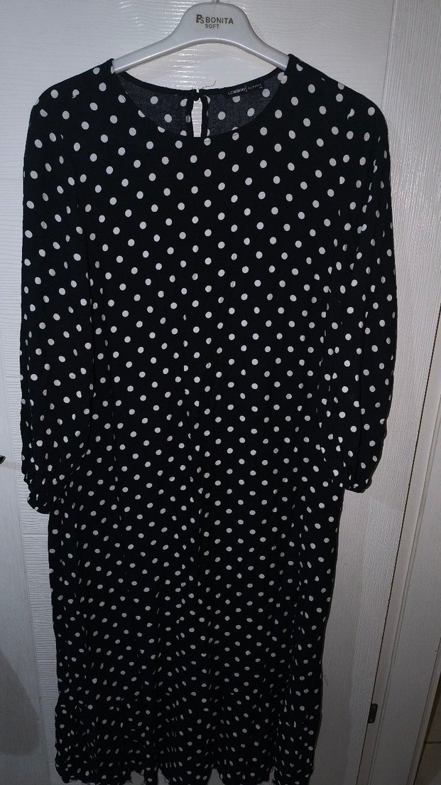 Puantiye desenli siyah midi elbise, uzun kollu, pileli ve bol kesimdir. Yuvarlak yaka ve sentetik kumaştan yapılmıştır, günlük rahat kullanım için uygundur.