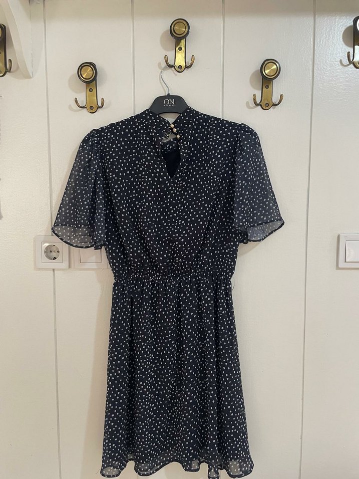 Bu siyah midi elbise, kısa kollu ve V yakalı bol kesimdir. Puantiye desenli ve kemerli, yumuşak sentetik kumaştan yapılmıştır, romantik akşamlar için uygundur.