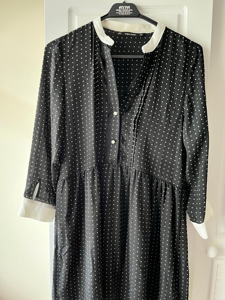 Uzun kollu, V yakalı ve düğmeli siyah midi elbise. Gevşek kesim, puantiye desenli ve yumuşak sentetik kumaştan yapılmıştır.