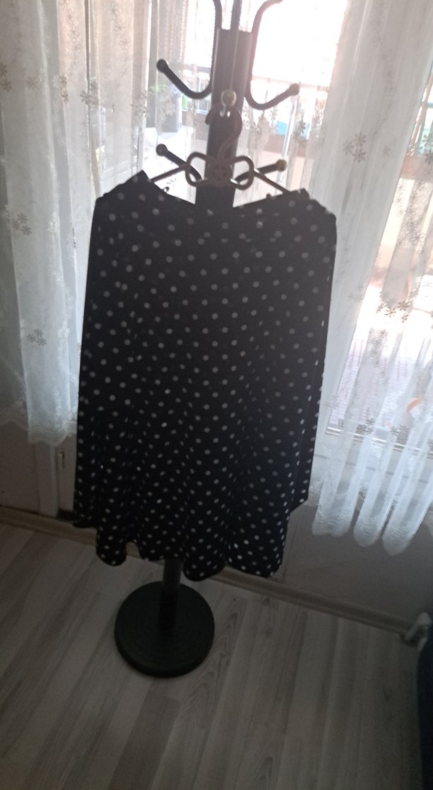 Beyaz puantiye desenli, siyah midi hamile eteği, bol kesim ve drapeli tasarımıyla, yumuşak sentetik kumaştan üretilmiştir. Günlük kullanıma uygun goth ve Paris tarzı.