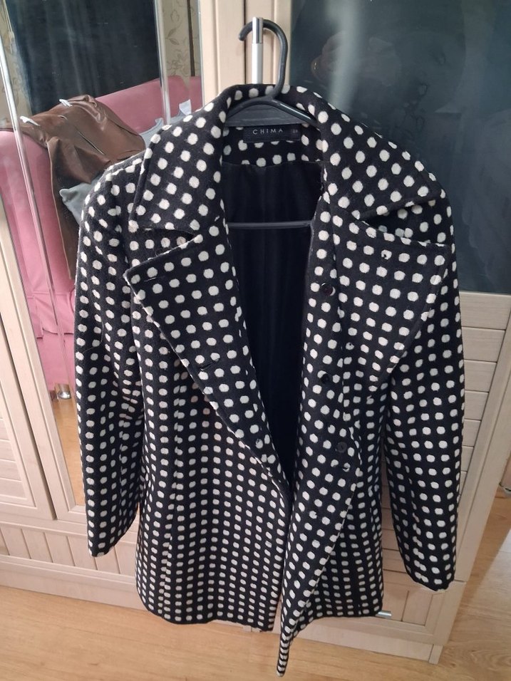Siyah puantiye desenli midi kaban, düğmeli ve kruvaze yakalıdır. Uzun kollu ve regular fit kesime sahip, sentetik kumaştan üretilmiştir.