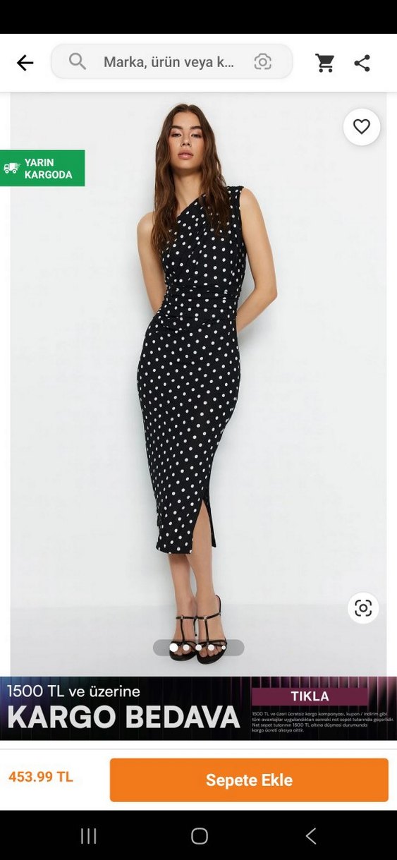 V yaka ve ince askılı, puantiye desenli siyah midi boy kalem elbise. Drapeli detay ve sentetik kumaştan, romantik akşamlar için uygun.