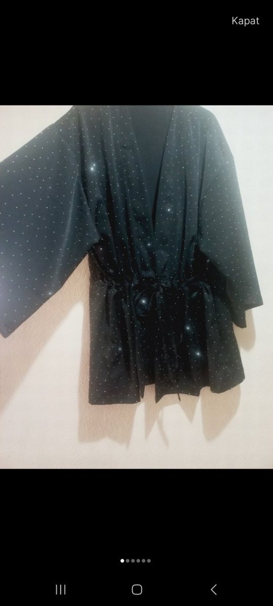 Siyah midi kimono, gevşek kesim, yakalı ve askılı kollu. Sentetik kumaştan, drapeli ve puantiye desenli. Günlük kullanıma uygun goth tarzı.