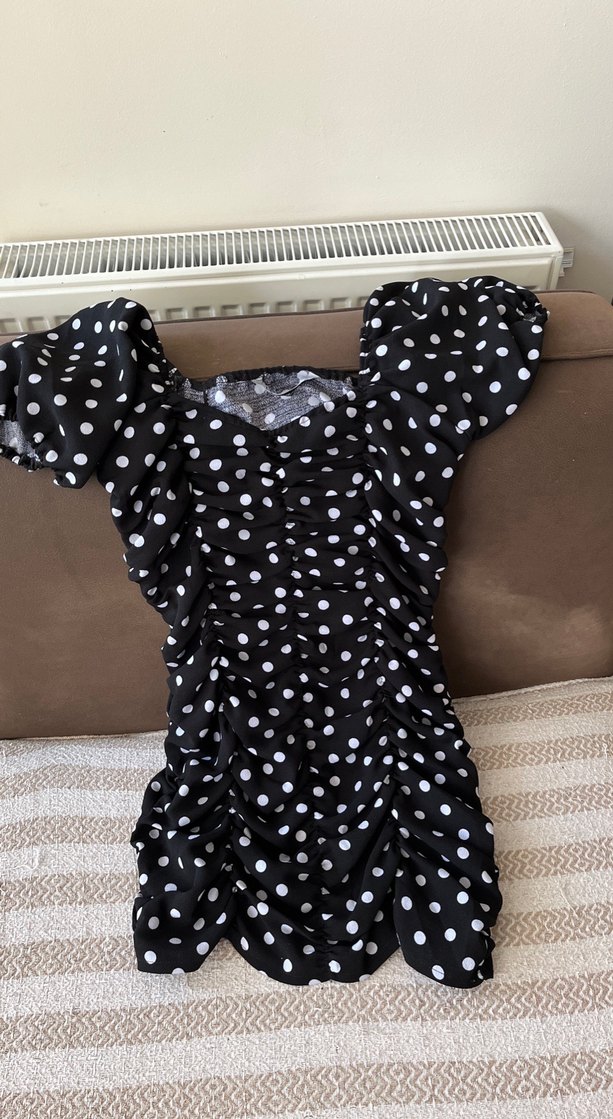 V yaka, kısa kollu ve fırfırlı detaylara sahip, puantiye desenli siyah midi mini elbise. Sadece iki düğünde giydim