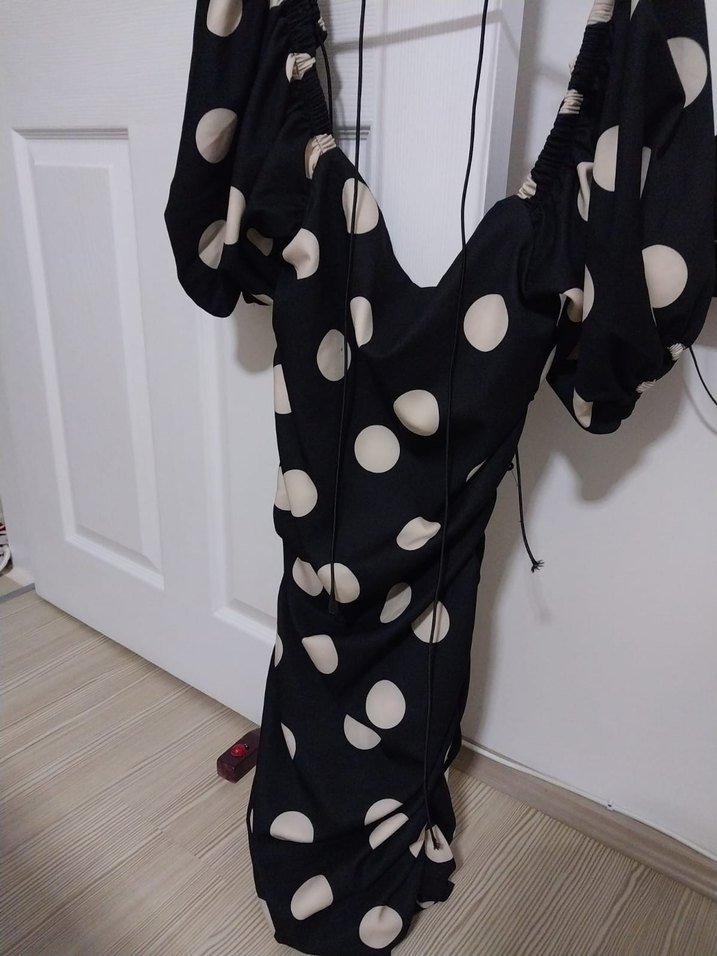 Siyah puantiye desenli mini elbise. Sırtı açık, iplerle bağcıklı. Balon kollu. Mooi butikten S beden. Etek kısmında büzgüleri mevcut. Sadece bir kere giyildi.