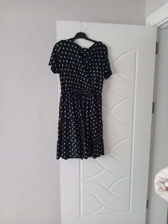 Pamuklu, kısa kollu, V yakalı siyah mini elbise. Puantiye desenli ve düğmeli, bol kesim rahat bir tasarıma sahiptir.