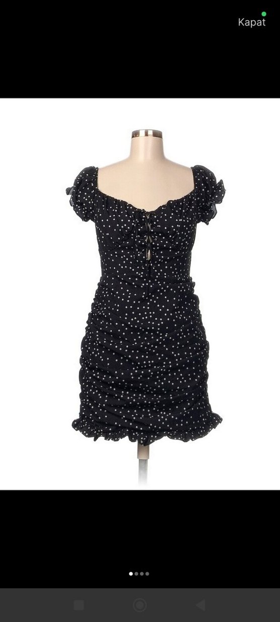 V yaka, kısa balon kollu, puantiye desenli siyah mini elbise. Yumuşak sentetik kumaştan, fit kesim ve fırfır detaylı. Gotik Paris tarzında cesur bir görünüm sunar.