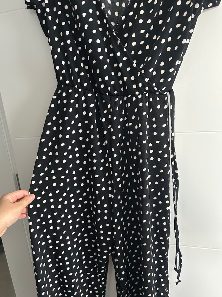 Siyah puantiye desenli tulum,düğmeli, v yaka, midi boyda, rahat kesimdir. Trendy günlük kullanım için uygundur.