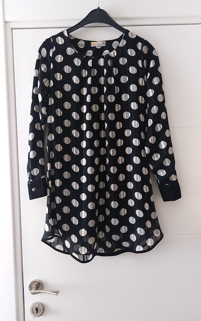 Beyaz puantiye desenli siyah uzun kollu ve düğmeli manşetlere sahip. Salaş kesimi, yuvarlak yakası ve midi boyuyla günlük kullanıma uygundur.Birkaç kez giyildi.Çok fazla kusuru yoktur belli değil giyilebilir durumda detayları fotoğrafta paylaşılmıştır iadeye sıcak bakmıyorum.