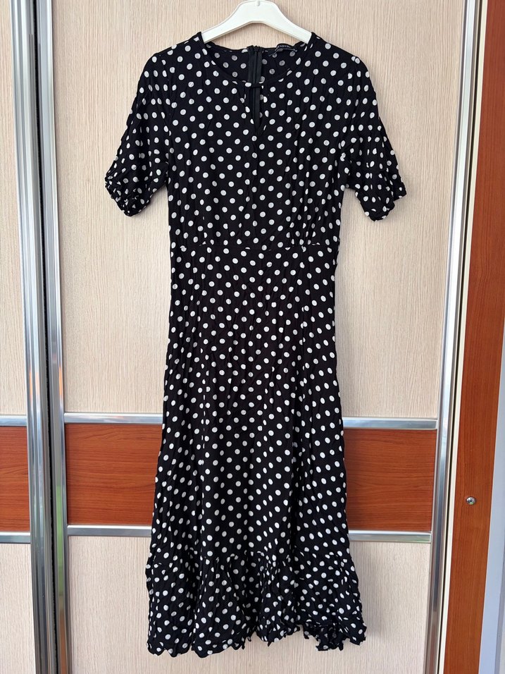 Siyah puantiye desenli uzun elbise. Sentetik kumaştan yapılmış, pile detayları ve rahat kesimiyle günlük sokak stiline uygundur.