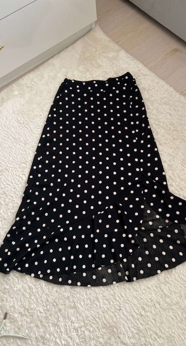 Siyah puantiye desenli, uzun ve fitted kesim midi etek. Sentetik yumuşak kumaştan, volan detaylı, bohem ve sokak stili için uygun.