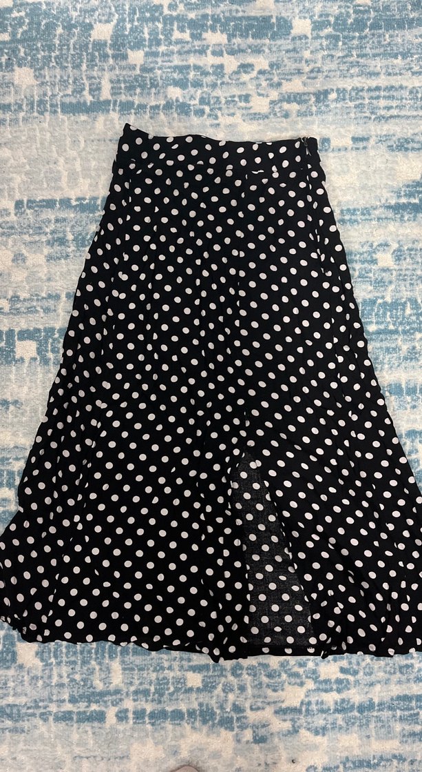 Bu siyah uzun etek, beyaz puantiye deseni ve pilili detaylarla bol kesimdir. Yumuşak pamuk kumaştan üretilmiştir, günlük sokak stiline uygundur.
