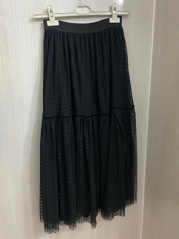 Uzun siyah etek, pilili detaylara ve puantiye desenine sahip. Yumuşak sentetik kumaştan, bol kesim ve günlük kullanıma uygun. Hiç kullanılmadı. Hatası vs yoktur. Teklif gönderebilirsiniz ✨