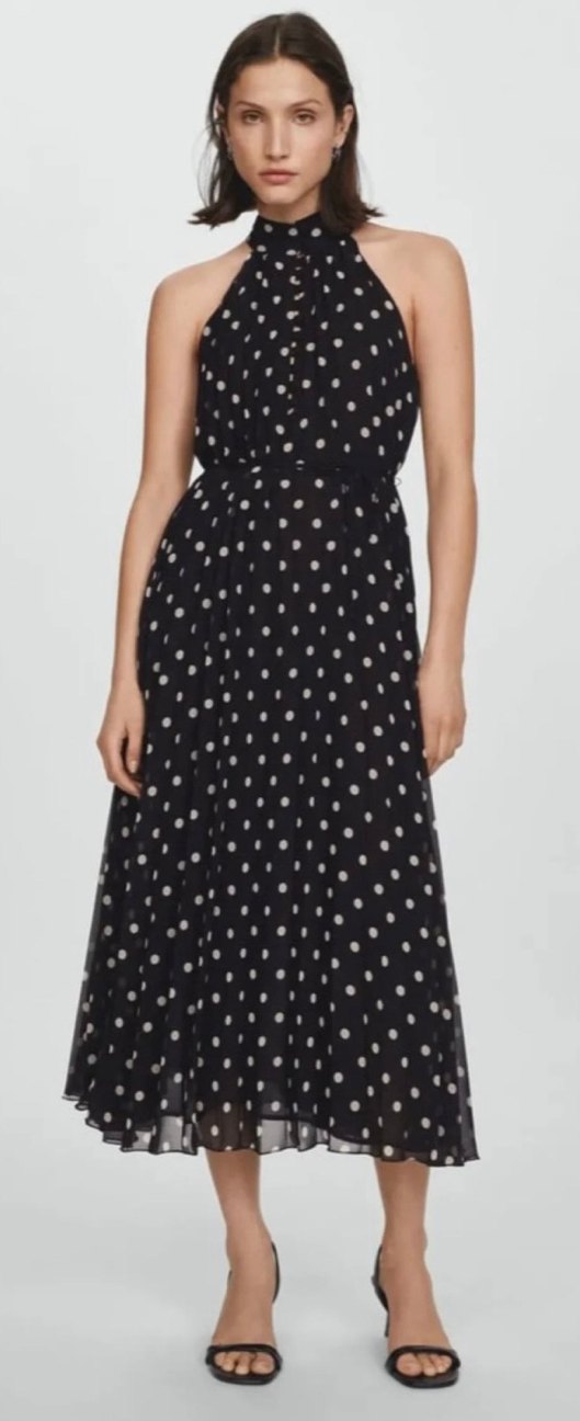Siyah puantiye desenli, kolsuz uzun elbise, tekne yaka ve bol kesimdir. Piliseli detaylarıyla romantik akşamlara uygundur. Yumuşak sentetik kumaştan üretilmiştir.