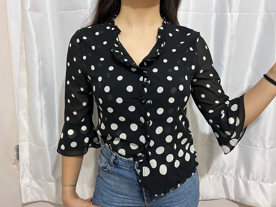 Puantiye Desenli Siyah V Yaka Kadın Gömlek