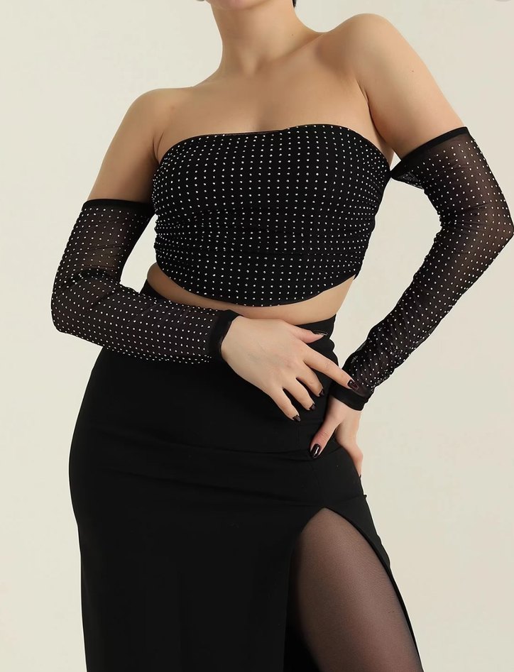 Fit kesim, straplez mini bustiyer, siyah puantiye desenli ve drapeli, askılı kollara sahip. Pürüzsüz sentetik kumaştan üretilmiş, parti ve gotik tarz için uygun. ✨408mo
