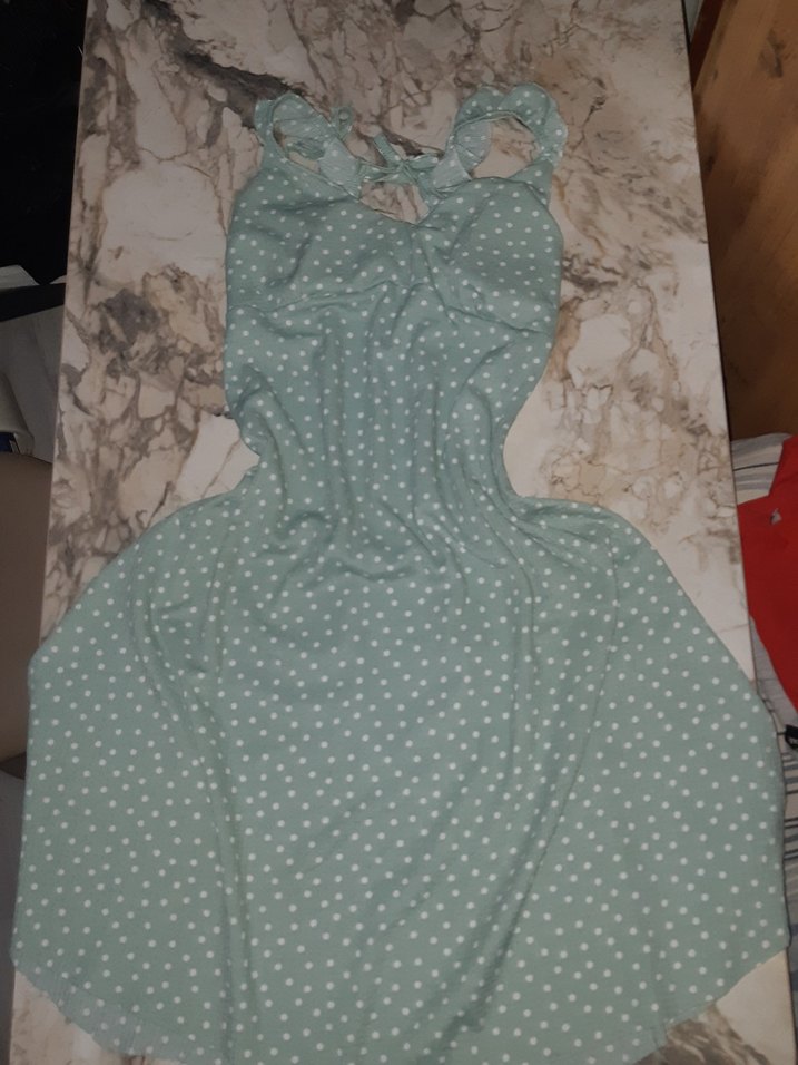 Uzun boy, kolsuz, V yakalı ve puantiye desenli turkuaz elbise salaş ve rahat bir parça uzunluğu hanım hanımcık 1 kere giydim.L beden giyerken oluyordu M bedene de olur ve sarar rahattır
