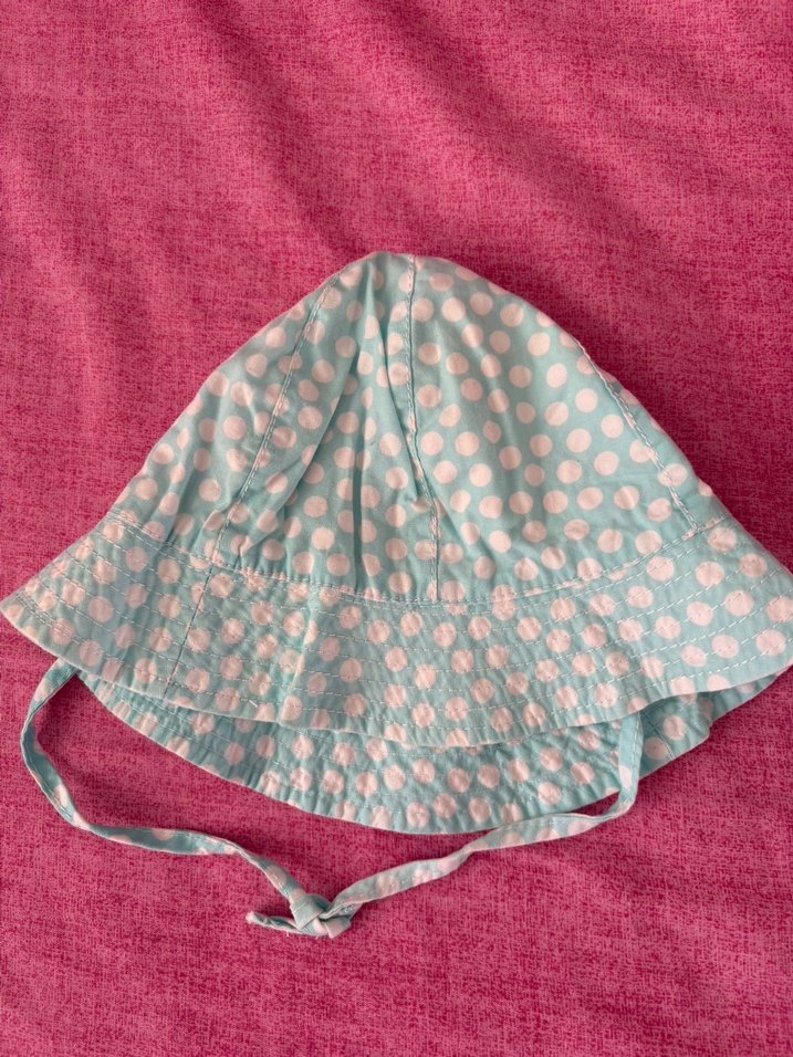 Turkuaz renkte, pastel puantiye desenli, fırfırlı ve bağcıklı çocuk şapkası, yumuşak sentetik kumaştan üretilmiştir.