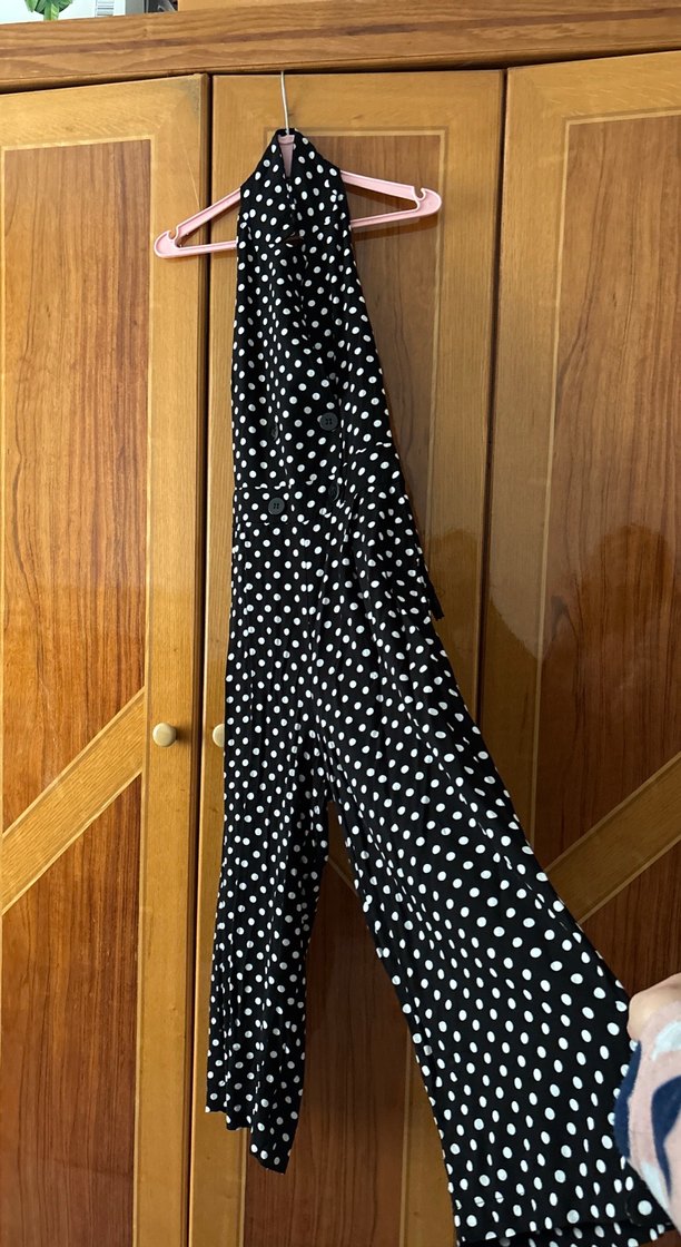 Siyah puantiye desenli tulum, fitted kesim, halter yaka ve askılıdır. Drapeli detaylara sahip, sokak modası ve Paris tarzını yansıtır. Günlük kullanıma uygundur.