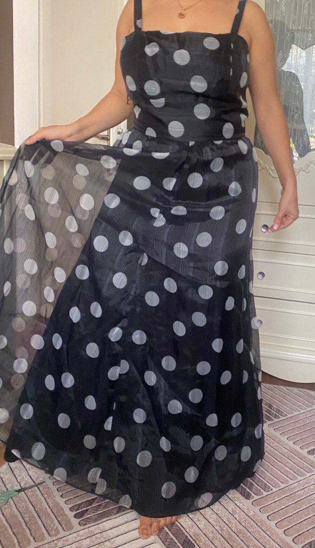 Uzun siyah straplez abiye, puantiye desenli ve drapeli tasarıma sahip. Sıkı kesim ve kolsuz model, gösterişli partiler için ideal.