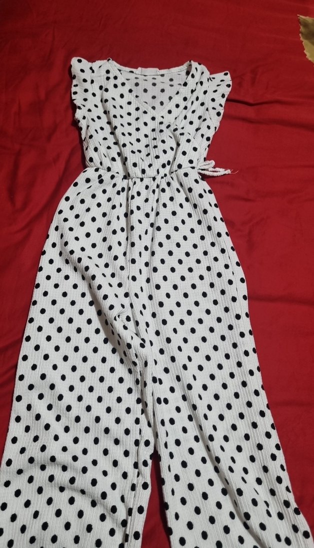 kizlar için uzun boy puantiye desenli tulum, sentetik kumaştan, pileli, V yakalı ve kolsuz tasarıma sahiptir. Rahat kesimiyle bohem tarzını yansıtır.