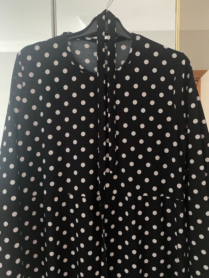 Siyah puantiye desenli, düğmeli, uzun kollu, Sentetik kumaştan, günlük sokak modasına uygun şık tasarım.