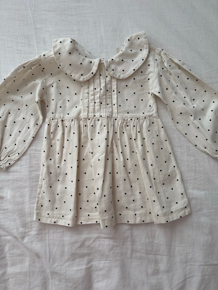 Pamuklu kumaştan, puantiye desenli, düğmeli, uzun kollu, yakalı ve bol kesim kız elbisesi.
