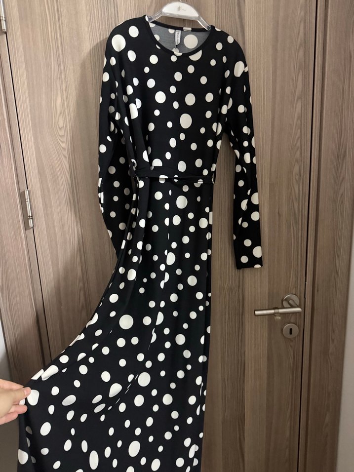 Siyah puantiye desenli, uzun kollu, drapeli ve yuvarlak yakalı bu elbise, ince kesimi ve sentetik dokusuyla minimalist sokak modasına uygundur.